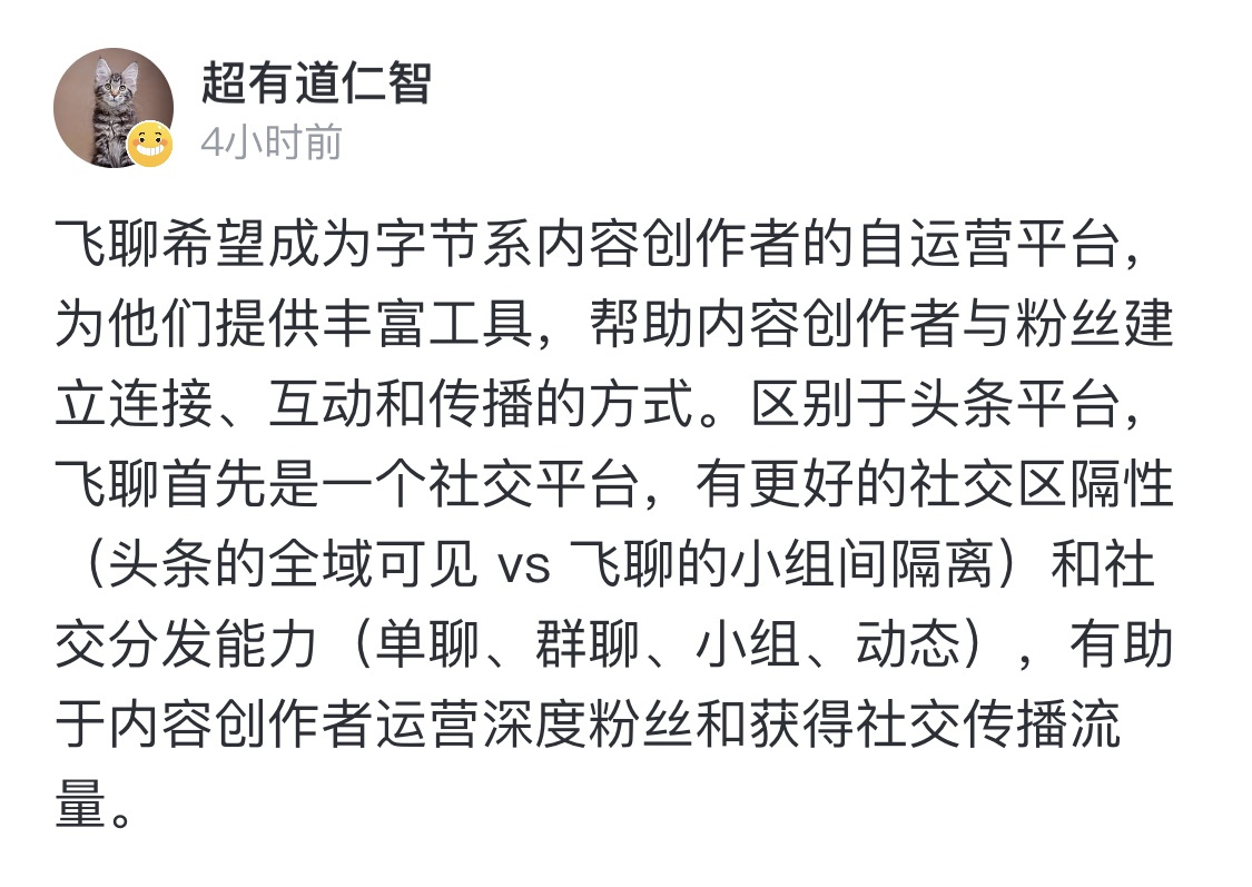头条号作者可以自动同步文章和动态,飞聊还提供了一个入口给头条号作者经营粉丝群。我简单在飞聊上刷了下,发现飞聊推荐的所谓优质内容,已经全部变成头条号作者的内容动态了。飞聊似乎更希望以头条号作者为中心,让内容创作者和粉丝之间建立一个有效的连接。今日头条被吐槽最多的地方在于,头条号的粉丝对内容推荐几乎没有任何作用,无论你有多少粉丝,流量最终的决定性因素仍然是算法,这是头条号价值远低于微信的主要原因。