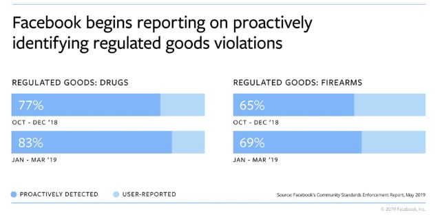 此外,今日发布的报告增设了两个新内容,即首次披露对平台上管制物品销售内容的采取行动信息(包括移除内容、贴上警示标语或者废除账户),主要指枪支武器和毒品相关的内容;同时,Facebook首次披露了用户申诉被管控内容的数据,以及审查后恢复相关内容展示的数据。