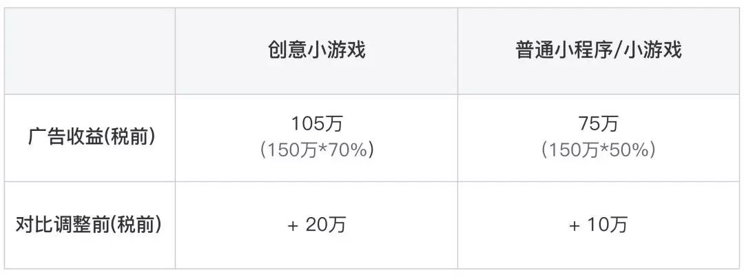 示例:假设单日广告收入流水为150万元,那么创意小游戏及普通小程序/小游戏的收益情况如下。注:创意小游戏是指在玩法、美术、剧情、音乐方面拥有高创新性的小游戏,在其名称下方有独有的“创意”标识。