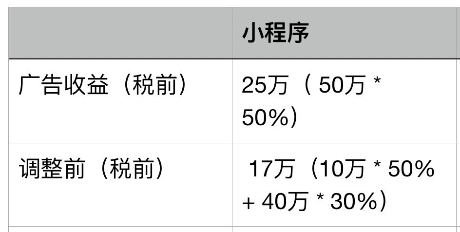 年8月1日至12月31日期间,小程序(含小游戏)流量主的广告收入分成比例进行调整,单日广告流水10-100万区间的部分,开发者可获得的分成由原来流水的30%上调到50%。这回的具体调整如下:单日广告收入流水100万元以内(含)的部分,开发者可获其中50%;单日广告收入流水超过100万元的部分,开发者可获其中30%