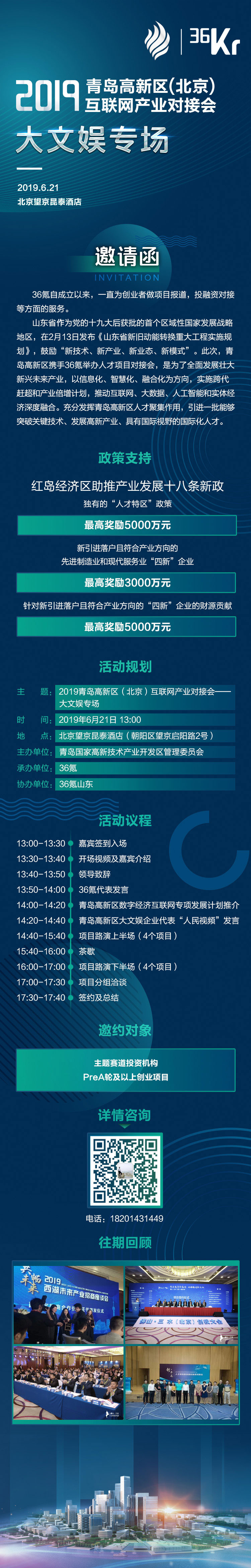6月21日,青岛高新区将携手36氪,在北京举办“2019青岛高新区(北京)互联网产业对接会——大文娱专场”活动。本次产业对接会,青岛高新区将携“红岛经济区助推产业发展十八条新政”,以及独有的“人才特区”政策,推介青岛高新区数字经济互联网专项发展计划。