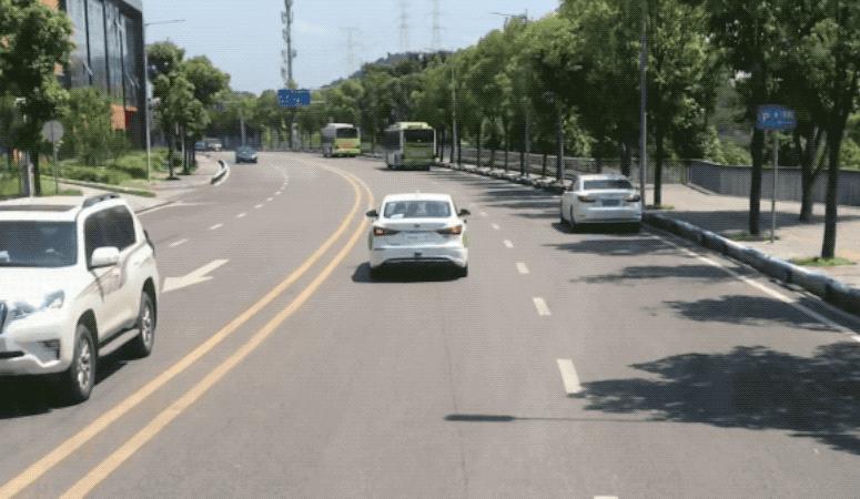 车辆行驶的全程开着双闪,周围有公交车、私家车和行人穿行。当然,车流不算密集,行人不多。