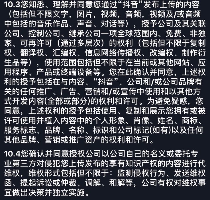抖音也在这样做。通过全球范围内获取正版音乐版权资源,为用户提供了一些正版音乐内容,支持用户创作短视频。此外,在抖音的用户协议中,通过抖音发布上传的内容,授予公司以及关联公司、控制公司、继承公司一项全球范围内、免费、非独家、可在许可的权益,这意味着某位用户上传的音乐和声音,可以作为用户们的公用素材库。