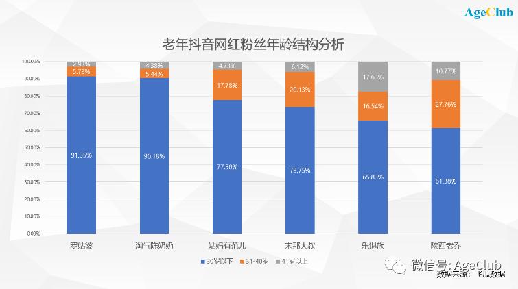 我们选取了6个有代表性的网红,“罗姑婆”和“淘气陈奶奶”的30岁以下粉丝占比90%以上,另外4个网红的30岁以下粉丝占比也在60%-80%之间。