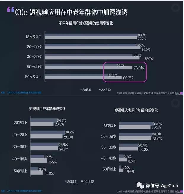 根据《2019中国网络视听发展研究报告》,对比50岁及以上用户在2018年12月与6月的短视频使用行为,使用率从54.5%上升到66.7%。