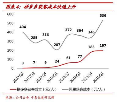 结合多家券商的分析报告来看,拼多多的获客成本在从2018年开始快速飙升。