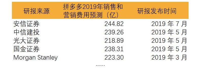 根据多家券商研报,拼多多2019年的营销费用大约在220亿至250亿之间。我们结合各家平均值,以232亿人民币作为拼多多2019年营销费用的市场预期。