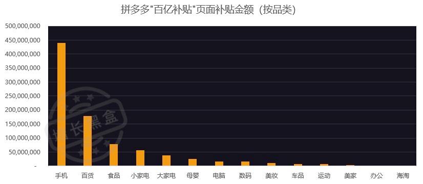 从各品类的补贴金额来看,手机品类一骑绝尘,4.4亿的补贴远远领先,占了总补贴的一半。