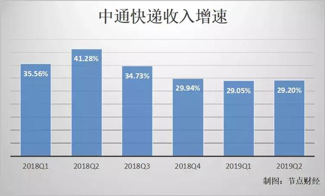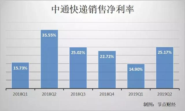 而净利率下降更明显,2019年第二季度中通销售净利率为25.17%,去年同期这个数值为35.55%,一年间下降了10个百分点。