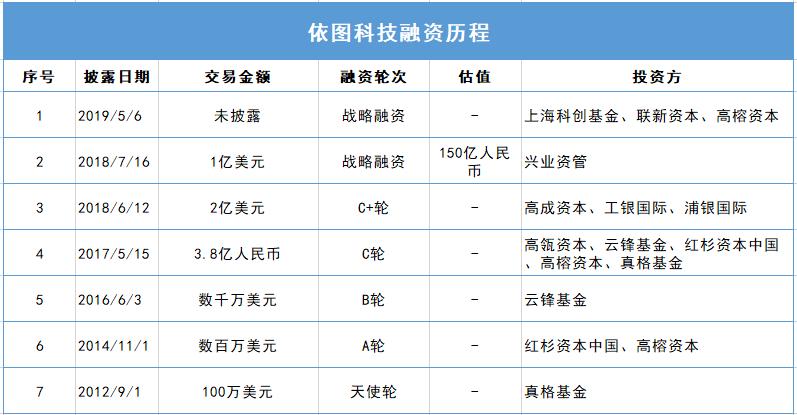 2013年,该公司获得了真格基金天使轮100万美元融资。而随后在2014年、2016年以及2017年,其又分别获得了红杉资本和高榕资本的数百万美元A轮融资、云锋基金领投的数千万美元B轮融资、高瓴资本集团领投的3.8亿C轮融资。2018年6月,依图科技又获得了由高成资本领投的C+轮2亿美元融资,而自同年的7月战略融资完成后,其估值已超过了150亿元。