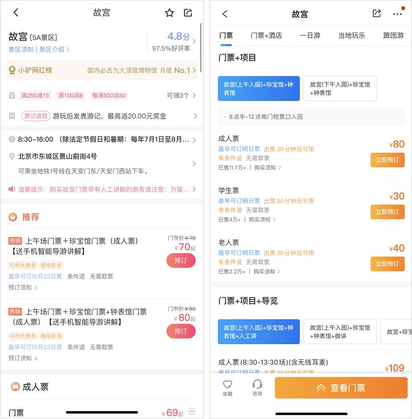 我在驴妈妈和携程上找到了故宫的门票,发现这些门票多多少少都绑定了内馆门票、导览和讲解等收费项目,没有单独的故宫门票可供选择。