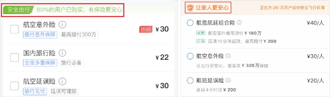 甚至有些平台会用“让家人更安心”、“搭配保险、守护全家”、“长途飞行有保险更安心”的文案来诱导消费者购买保险。