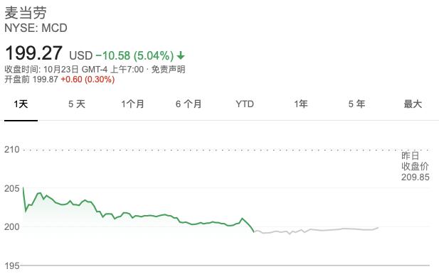 受财报拖累,麦当劳的股价大跌5%,市值蒸发80亿美金,约合人民币566亿元。