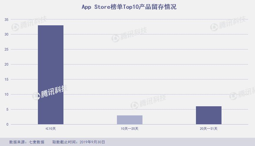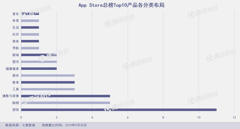 9月,总榜Top 10共出现过42款产品,其中11款为游戏类产品,购物及摄影类均占据5款。