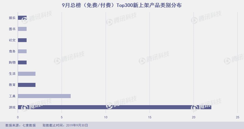 37款进入App Store总榜Top 300(以下简称“总榜”),游戏类以22款新产品居多,工具类以6款新产品居次,教育和生活类分别占据2款,购物、商务、社交、图书和娱乐分别占据1款。
