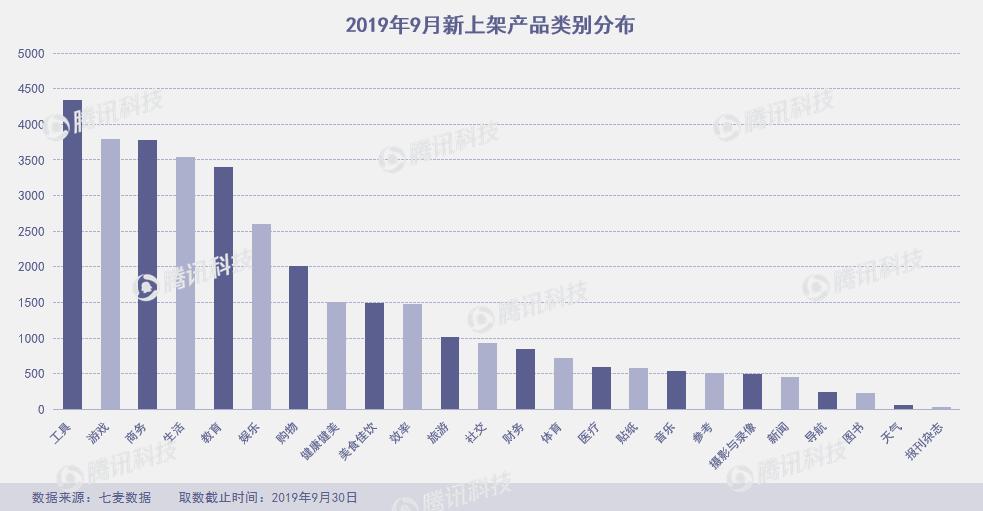 9月份,工具、游戏、商务、生活和教育5个类别上新产品数量超过3000款,其中工具类别上新数量最多,达4348款。
