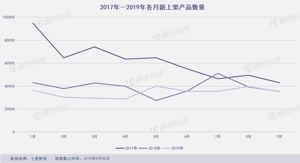 相比较于2017年和2018年,今年9月App Store产品上新数量持续走低,新上架产品约为3.5万款,较8月份上新数量(3.9万款)下滑11%。