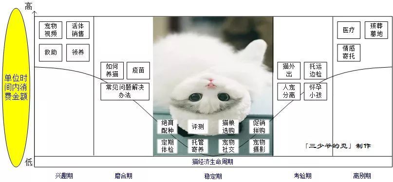 我把整个人宠交互过程划分为兴趣期、磨合期、稳定期、考验期、离别期等几个阶段。在每个阶段,用户的需求有一些共同点(比如食品、用品),但也有很多本阶段特有的需求。接下来,我们把猫咪自然生命周期和人宠交互节点进行叠加整合,形成一个完整的猫经济生命周期。