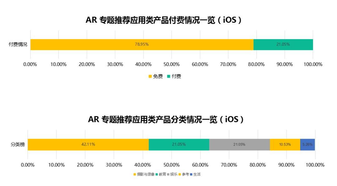 从以上AppStore推荐过的5个AR专题来看,游戏类产品数量较少,苹果小编没有特别侧重某个分类,AR游戏开发者均可尝试自荐。应用类产品对摄影与录像类、教育类、娱乐类的免费产品有较高的推荐率,符合条件的产品可以向苹果自荐,增大在专题中的推荐概率。