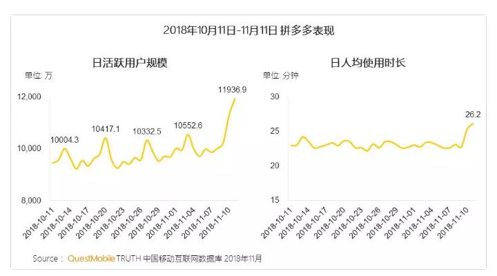 可以作为参考的是,去年双十一期间,借助“拆宝箱”、“限时免单”等活动,拼多多的DAU单月增长了近两千万。