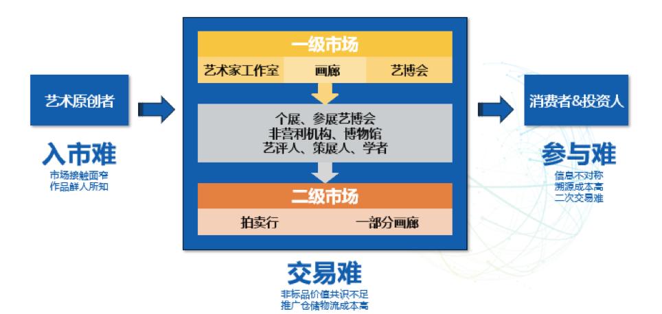 第三,广大艺术消费者和投资者参与难。信息不对称,溯源成本高,流通市场范围小,投资风险大,致使大量的艺术消费者和投资者缺乏信心和控制风险的工具,限制了艺术消费和投资群体的体量。