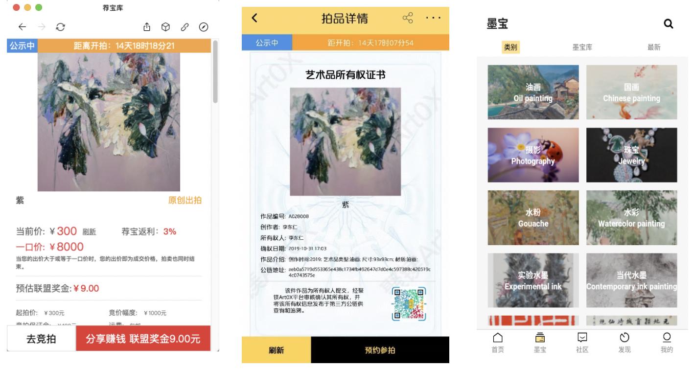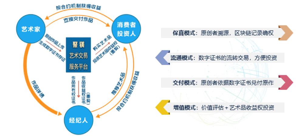 基于对艺术交易市场痛点的解析,聚镁Art0X采用区块链+私域流量分销的模式搭建线上艺术资产交易服务平台,开发了墨符、墨契等艺术资产投资小工具。这些工具使更多的人在不需要实际持有原作的情况下也能参与到艺术品投资中来,从而降低参与艺术投资的门槛,提高了交易参与度。