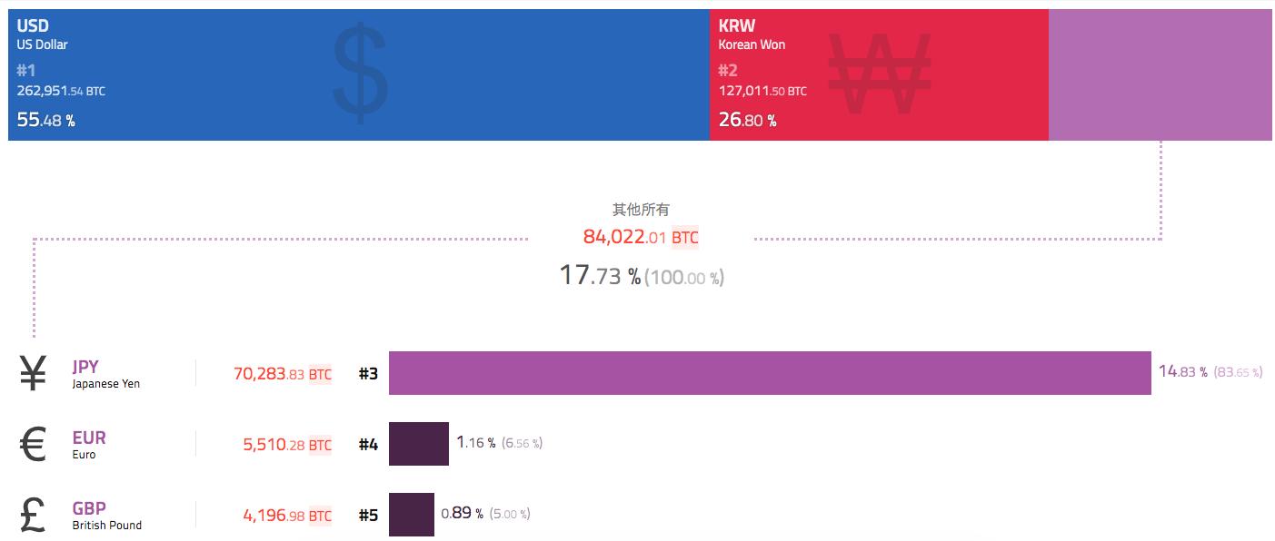 本周比特币兑法币交易中,美元排名第一,占比55.48% ,相较于上周大跌24%;令人惊异的是自7月份我们监控以来一直排名第三的韩元,本周兑比特币交易占比激增6.5倍,为26.8%;而日元占比则大跌25%至25.7%。