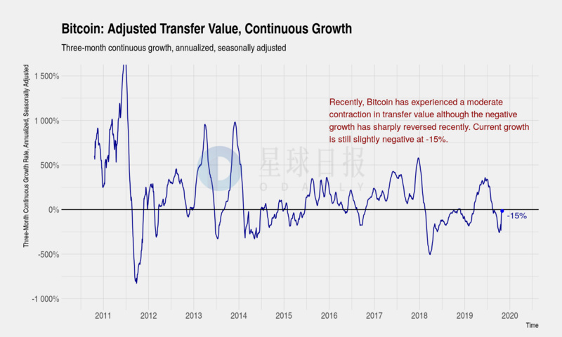 加密货币分析公司Coinmetrics统计指出,GDP是指特定经济体在一段时间内生产的商品和服务的总增加值,接近GDP的指数是“调整后的转移价值”。如果将调整后的转移价值的1%用于商品和服务,则比特币的名义GDP相当于84亿美元,相当于全球第140大经济体。此外,比特币GDP的增长率为-15%。