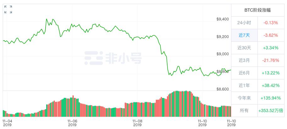 本周,比特币7日涨幅为-3.6%。11月1日午时比特币开始极速下挫,跌破9000美元,11小时后累计下跌5%,目前仍在8800美元附近横盘震荡。