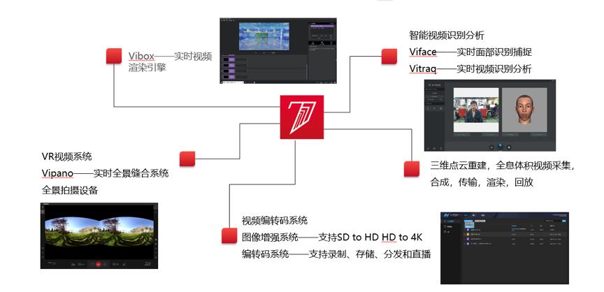 七维科技成立于2014年,将计算机视觉AI方面技术应用到视频娱乐场景,面向企业端提供VR/AR、融媒体等泛内容领域的技术支持,同时也提供相应的设备、内容生产和营销等全链条服务。经过5年的发展,七维科技已经形成了针对“4K + 5G + VR/AR + 融媒体+AI”等泛视频领域产品体系,拥有数十项专利技术,具体产品形态包括: