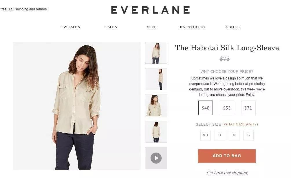比如一件原价 78 美金的衬衫,Everlane 提供了 $46、$55 和 $71 三档价格。46美金包括了生产和运输成本;55美金的那档价格,网页上会显示:这个价格能让我们赚9美金,还能有富余给团队;选择71美金会显示:“这个价格能让我们更好地成长。谢谢支持!”