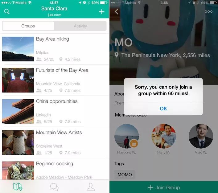 与陌陌显示“附近的人”,点对点社交理念不同,Blupe的中心是“群聊”。用户因为某一特定的兴趣或目的聚集在一个群里,却无法关注某个具体的人。想要私聊某人,需要通过群找到人,聊天记录也会被记录在群聊天历史中。