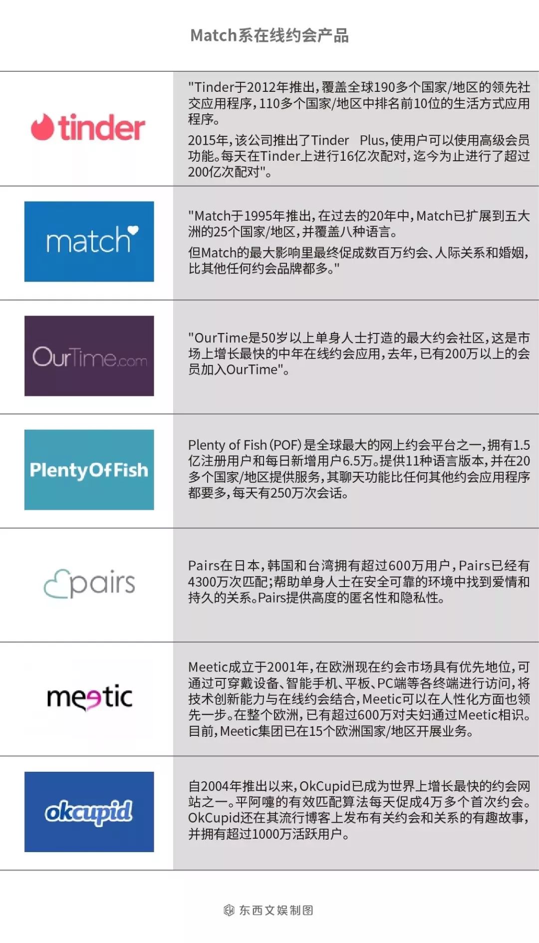 其母公司Match Group堪称“全球社交产品巨头”,旗下其他产品如OkCupid、Hinge、Plenty of Fish针对不同国家/地区的用户进行了全年龄层式覆盖。陌陌在收购探探时,双方就表示要打造“中国的Match Group”。