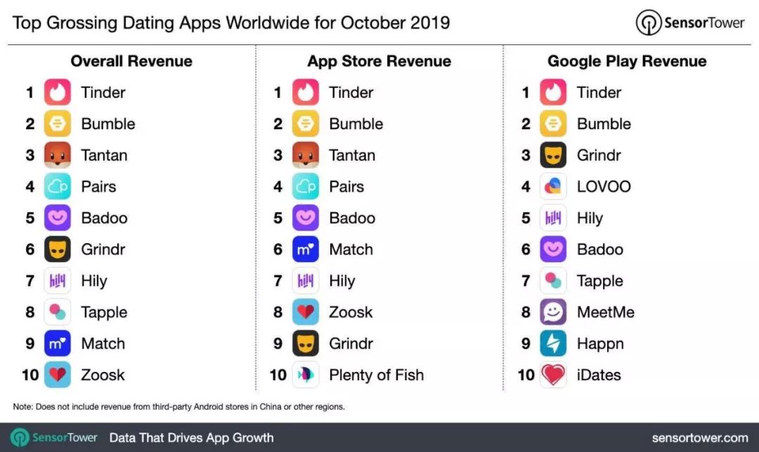 2019年十月份全球约会软件收入排行,图源:Sensortower.com