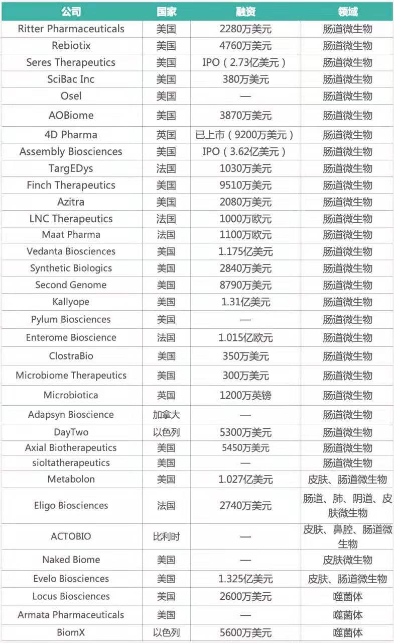 自2003年美国Osel作为第一家获得FDA授权的企业进行其活性生物治疗临床测试以来,34家布局治疗领域的企业(图3)融资总额已逾19亿美元,推动着上百个管线的开发,然而现实却显得有些骨感:该领域仍然没有一款药物或疗法成功获得FDA批准上市。
