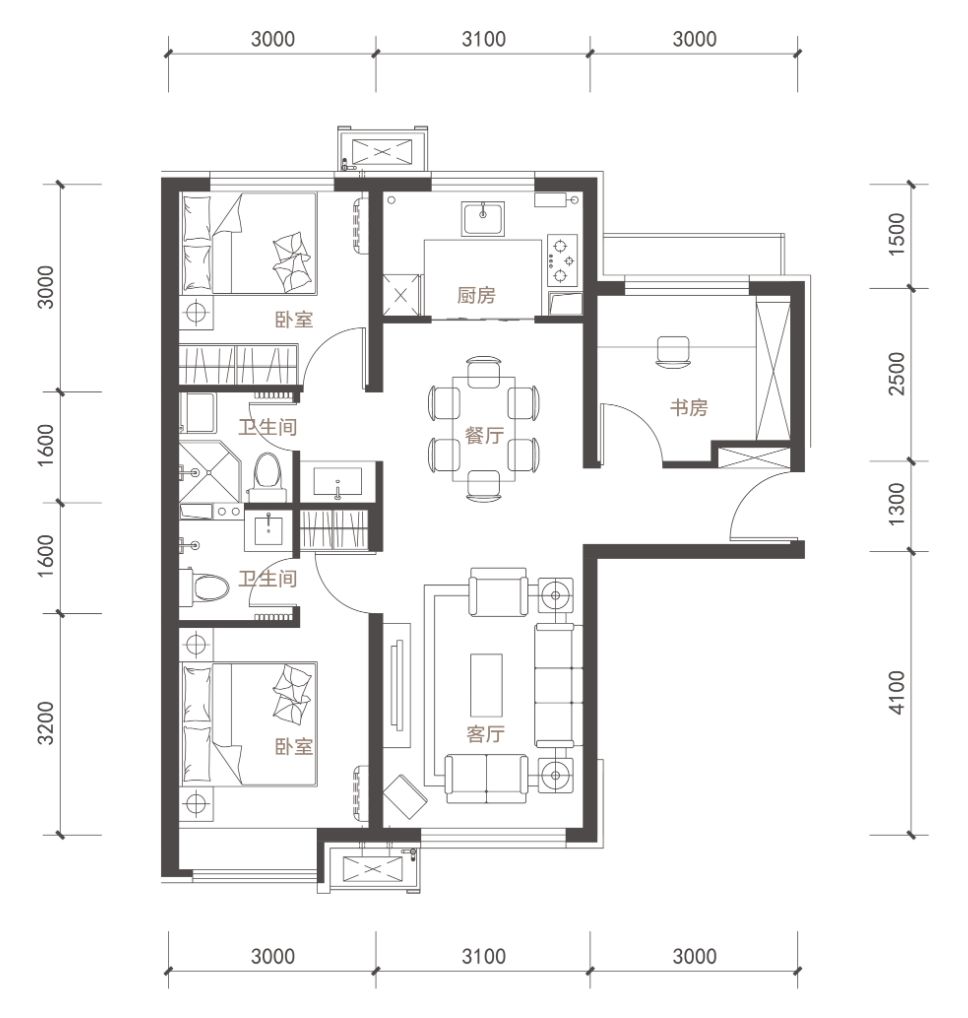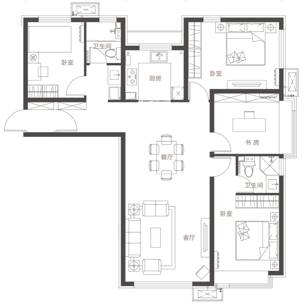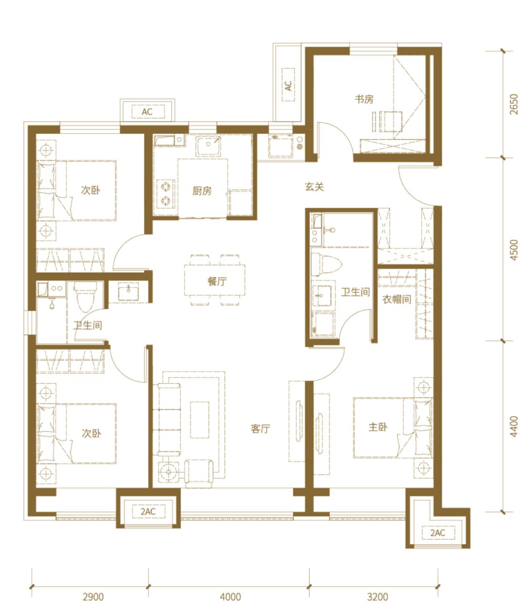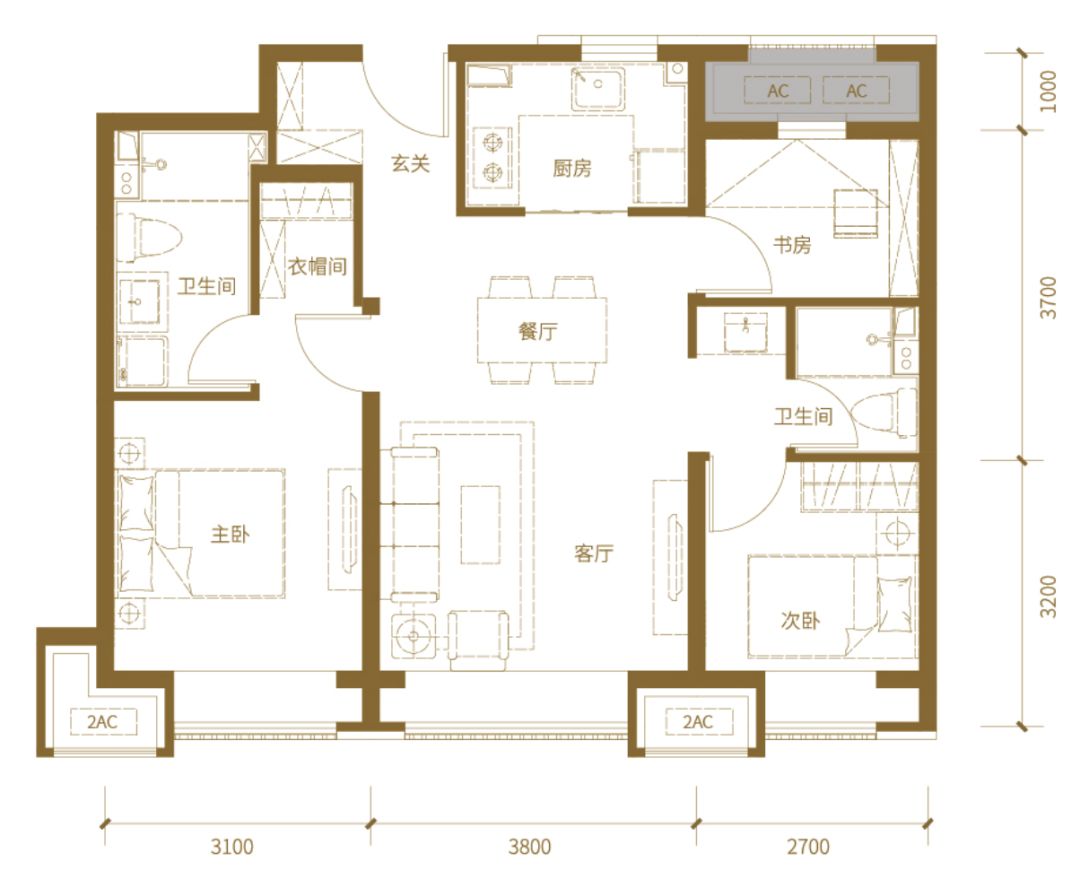 我们再来看A1。A1的户型品质稍微好一些,南北通透,属于“次眼镜”户型。主卧配独立卫浴,次卫干湿分离。书房采光不错,适合修生养息。然而有一个缺点就是面宽太窄,主采光面积受限,略有瑕疵。