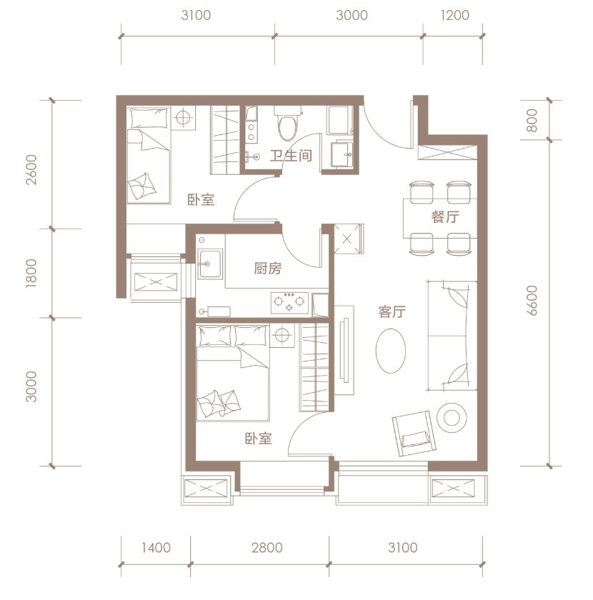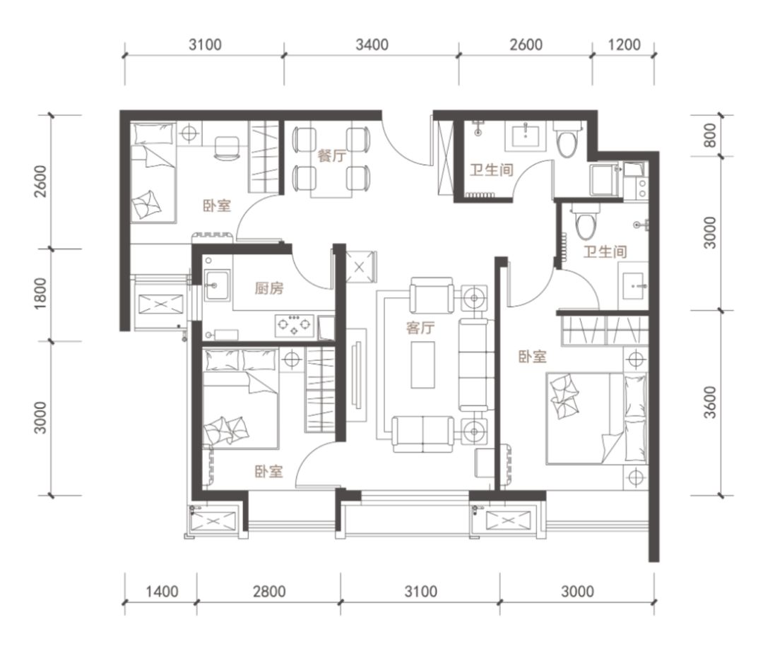 A2可以说是很糟糕。户型虽方正,南北朝向,然而却是单通透,通风不佳。厨房“镶嵌”在两个卧室之间,没有动静隔离,会影响到日常起居,而且两个卫生间挨着,虽然号称是干湿分离,但是对于次卧来说并不友好。而且次卧采光受限,连单采光都无法做到。此户型可以说是很奇葩。
