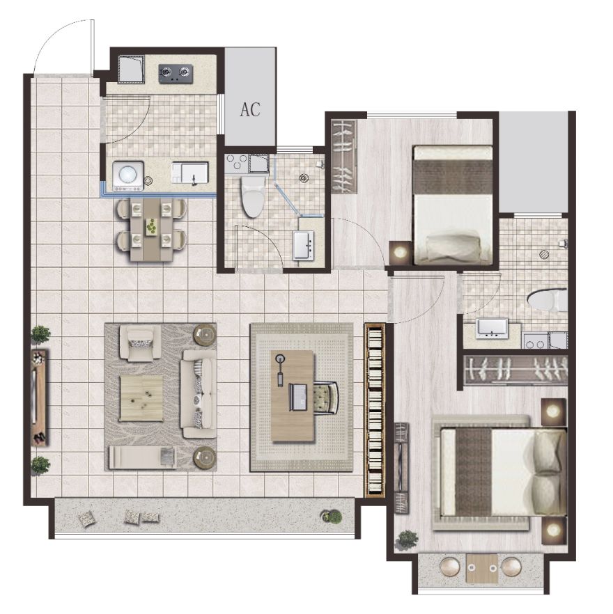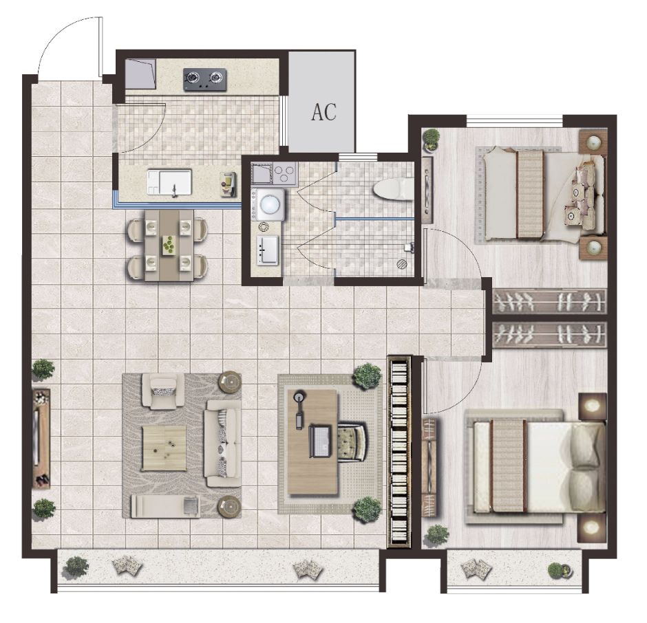 相对A户型,89平米的B户型可谓是天地之别。B户型方正,南北通透,长面宽短进深,是标准的“眼镜”户型。采光足够,主卧配套独立卫浴,次卫干湿分离,接待客人非常方便。