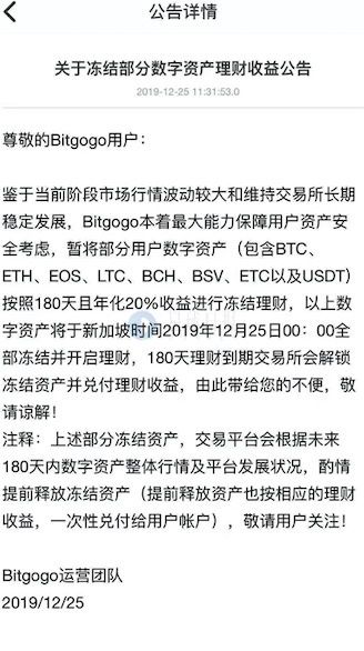 当日下午,Bitgogo 交易所发布公告称暂将部分用户数字资产(包含 BTC、ETH、EOS、LTC、BCH、BSV、ETC 以及 USDT)按照年化 20% 收益进行冻结理财,180 天理财到期交易所会解锁冻结资产并兑付理财收益。