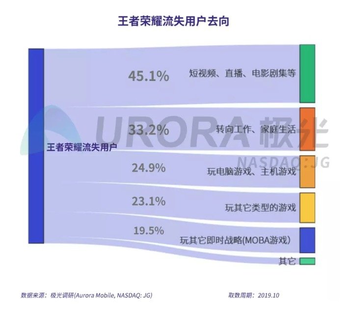 其中,在《王者荣耀》的流失用户中,有近 45% 的玩家选择转向短视频、在线阅读和电影,还有近三成转向了家庭生活和工作,剩下的才是那些选择了其它游戏的用户。