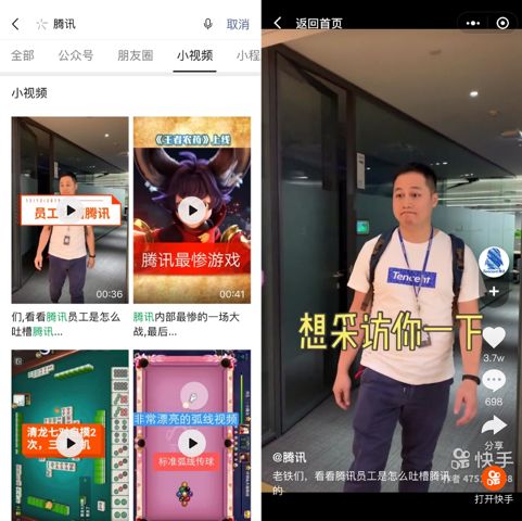 据投中网了解,腾讯曾在两年前封禁了抖音、火山视频、快手等软件,2019年6月,微信解封快手短视频分享功能,快手视频链接能够分享到微信朋友圈。最新动态是,微信搜一搜页面已经可以搜“小视频”,而小视频中所有短视频都来自快手,点开短视频可以跳转到快手小程序或APP。
