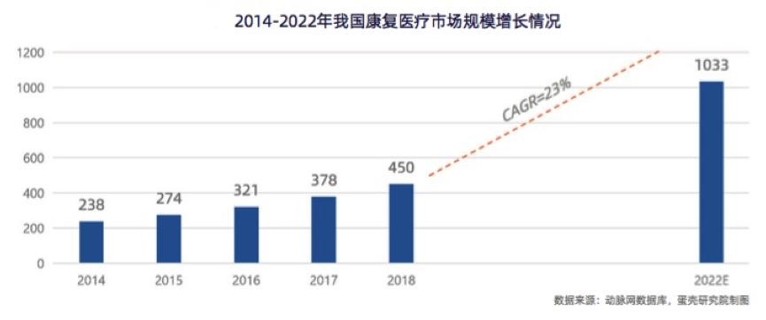 根据动脉网和蛋壳研究院联合发布的《2019康复产业发展潜力研究报告》显示, 2018年我国人均康复费用在32元左右,随着人们收入水平的提高和康复费用支出的增加,预计到2022年人均康复费用支出在74元左右,届时我国康复市场规模将达到1033亿元。