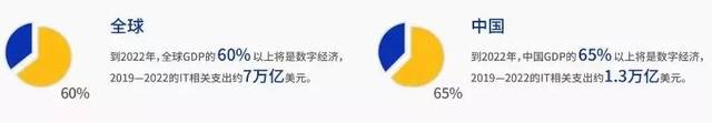 而若从企业数字化转型市场规模来看:也能发现数字经济的比重正逐年提升,这也要求企业们实现更多的IT相关支出。IDC发布的《2018中国企业数字化发展报告》显示,2018年,数字经济规模已达31.3万亿元,而到2022年,全球GDP的60%以上将是数字经济,中国GDP的65%以上都将是数字经济;2019-2022的IT相关支出约1.3万亿美元,数字技术将全面渗透各个行业,并实现跨界融合和创新。而这对于肩负着推动中小企业实现数字化转型使命的巨头们而言,也是巨大的机遇之地。