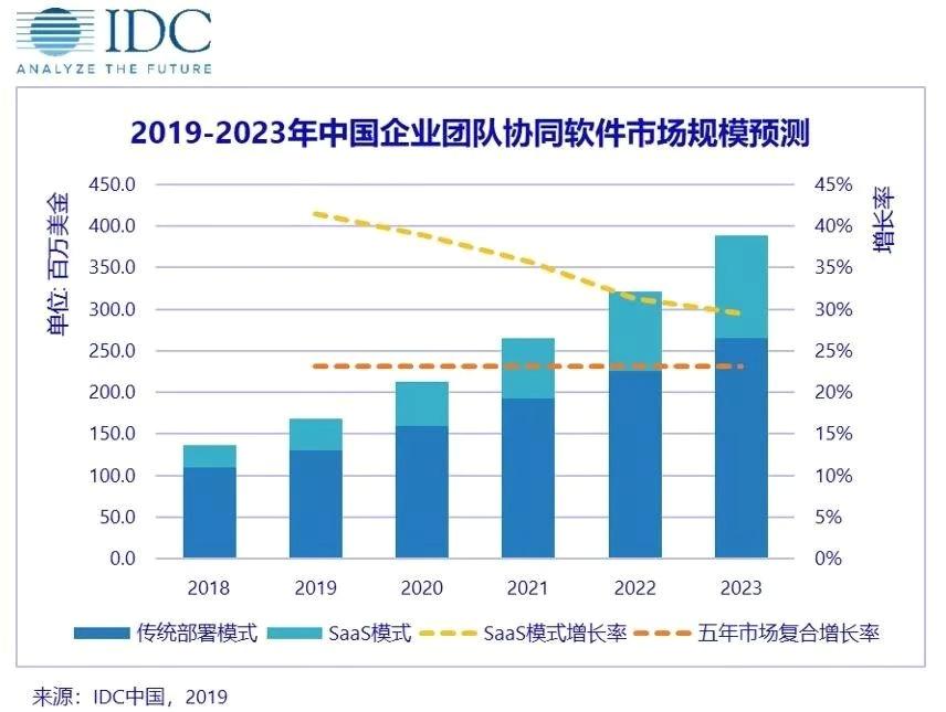 据IDC发布的《2018年下半年中国企业团队协同软件市场跟踪报告》显示:2018年全年中国企业团队协同软件市场厂商整体收入1.37亿美元,同比增长26.2%。其预计到2023年,中国企业团队协同软件市场规模将达到3.88亿美元,即使放眼全球市场,2018年全球企业协同软件市场规模也仅为27亿美元左右。