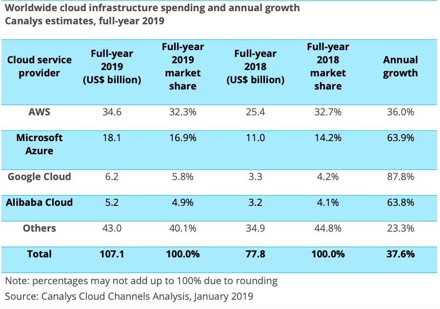 据Canalys发布最新调研数据显示:2019年全球云服务市场规模同比增长37.6%达到了1071亿美元(人民币7500亿元),预计2020年全球云服务市场规模达1410亿美元,同比增长32%,到2024年将增长至2840亿美元(人民币约2万亿元)。