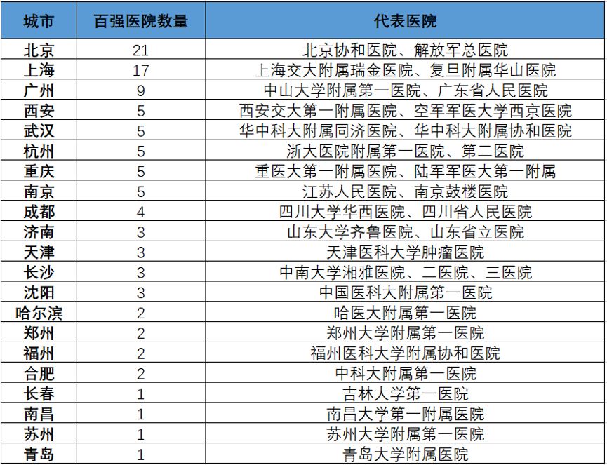 1、几乎都是区域中心城市和省会城市。北上广依然是排在榜单之首,占了百强医院近半的比例。经济全国排名第3的深圳,无一家入围。剩下的排在靠前的城市,都是传统的一些强省会城市,比如有5所的全国百强医院的西安、武汉、杭州、重庆和南京。
