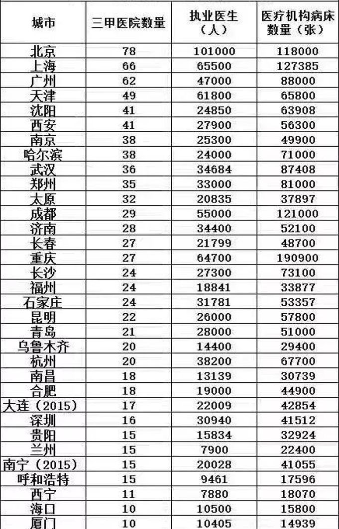 看一个城市的医疗水平和资源如何,不能只看医院数量和床位数量,而关键是要看医疗水平如何。医疗水平的判断,最核心是看一个城市顶尖的医院数量。