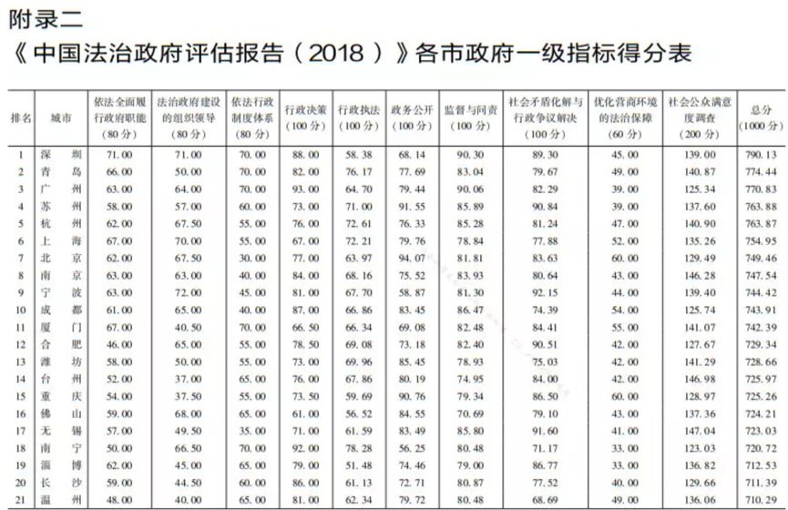 如果要用分数或排名来看一个城市的法治文明情况的话,我们可以参考中国政法大学每年发布的《中国法治政府评估报告》。