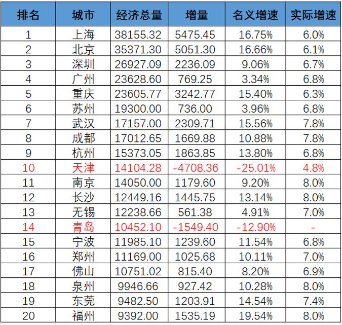 前20名榜单中有两个 显眼的“另类“城市,天津和青岛,GDP不升反降。两个城市由于经济普查,GDP缩水,呈现负增长。尤其是天津,GDP1年缩水4700亿,由18年的188809亿大降为14104亿,排名从第六降到第十位。