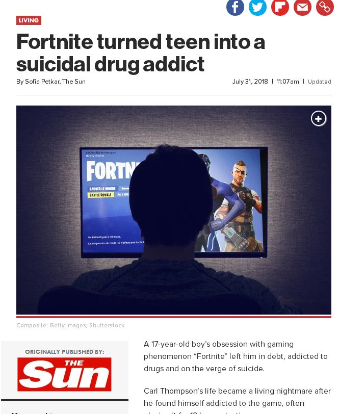 2018年初,随着《堡垒之夜》的快速爆红,欧美家长与游戏的矛盾集中爆发。英国媒体发表了一篇名为《堡垒之夜如何将青少年变成瘾君子》的文章,文中讲述了一个17岁少年是如何因为《堡垒之夜》游戏上瘾,一步步沦落到为游戏逃课、偷钱。后来因为精神不济,男孩为了游戏甚至过度使用安非他明,结果导致自己成为了真正的瘾君子。在生活被毁,学业荒废后,男孩经历了几次自杀未遂,最终被父母送进了医院。